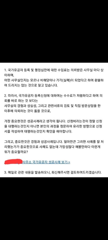 " 다른 행정사무소는 비해당되거나 기각 실폐 하면 환불을 안해주는데 우리행정사무소는 비해당되거나 기각되도 환불을 해줍니다" 라고 전 윗글보고 이해한건데