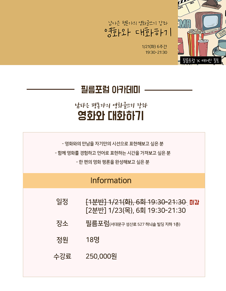 [2분반모집][필름포럼아카데미x매거진필로] 남다은평론가의 영화글쓰기 : 영화와 대화하기 (1/23개강)