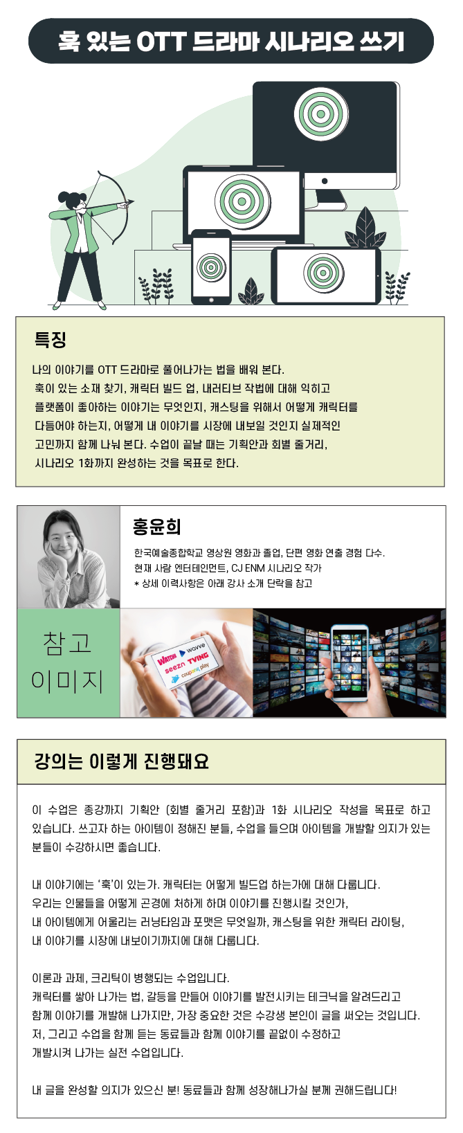 나의 이야기를 OTT 드라마로 풀어나가는 법을 배워 본다. 훅이 있는 소재 찾기, 캐릭터 빌드 업, 내러티브 작법에 대해 익히고 플랫폼이 좋아하는 이야기는 무엇인지, 캐스팅을 위해서 어떻게 캐릭터를 다듬어야 하는지, 어떻게 내 이야기를 시장에 내보일 것인지 실제적인 고민까지 함께 나눠 본다. 수업이 끝날 때는 기획안과 회별 줄거리, 시나리오 1화까지 완성하는 것을 목표로 한다.