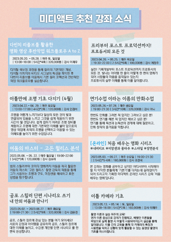 [미디액트 추천 강좌 소식] 다빈치 리졸브 / 조명 기초 / 카메라 기초 / 스릴러 시나리오 쓰기 등
