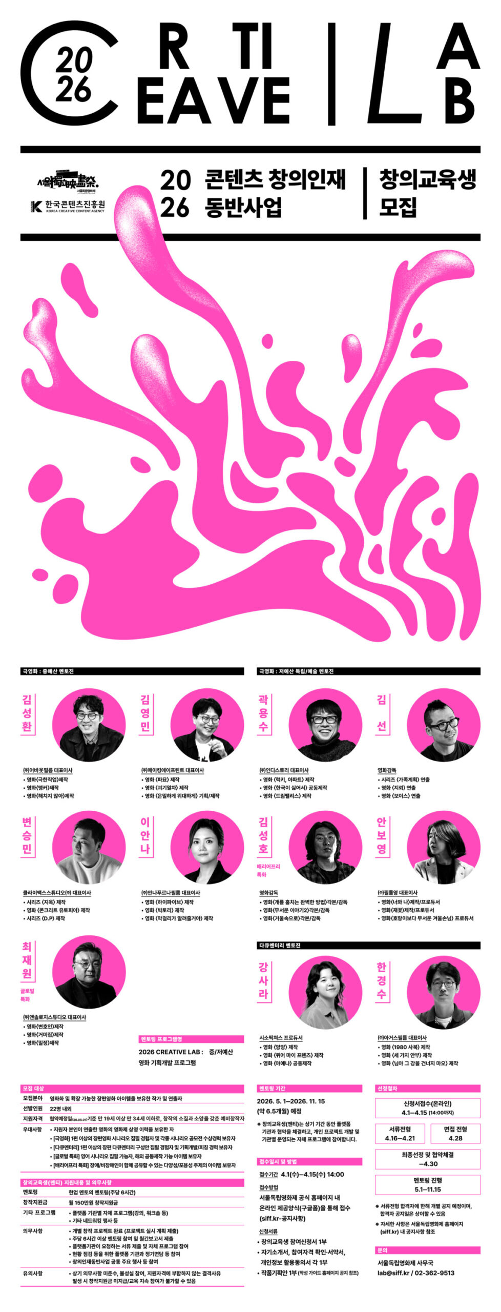 천만 영화부터 초저예산 영화까지, 상업 영화에서 독립·예술 영화까지를 아우르는 국내 최정상급 멘토진이 실현 가능한 영화화의 든든한 파트너로 함께합니다. 다큐멘터리 부문 신설로 한층 확장된 본 사업에, 창작자 여러분의 적극적인 관심과 참여를 바랍니다.
