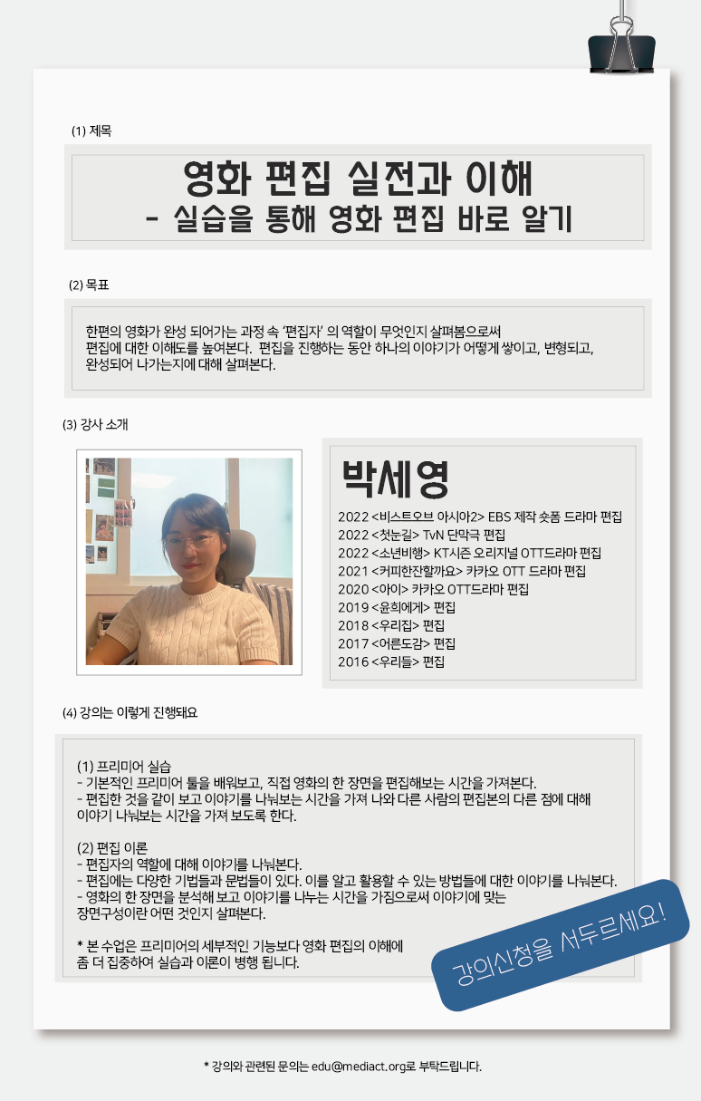 * 본 수업은 프리미어의 세부적인 기능보다 영화 편집의 이해에 좀 더 집중하여 실습과 이론이 병행 됩니다.