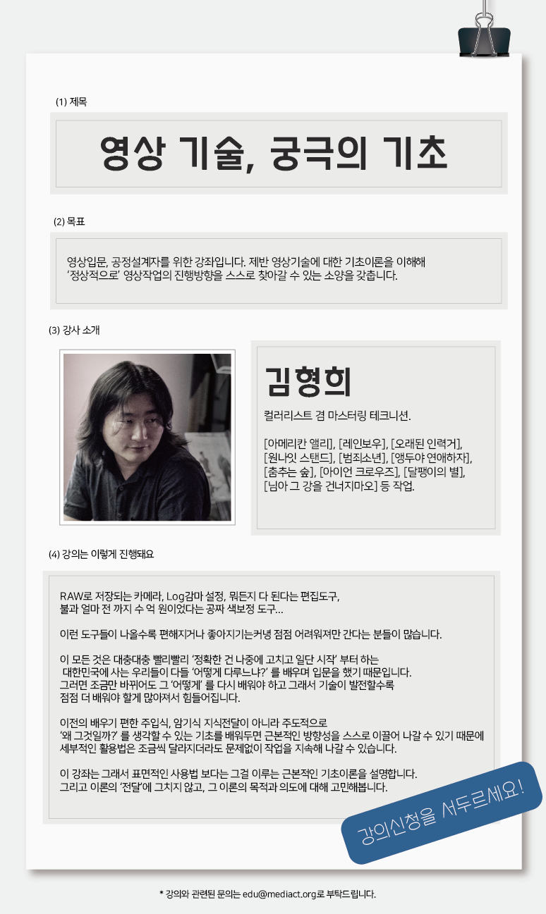 제반 영상기술에 대한 기초이론을 이해해‘정상적으로’ 영상작업의 진행방향을 스스로 찾아갈 수 있는 소양을 갖춥니다.